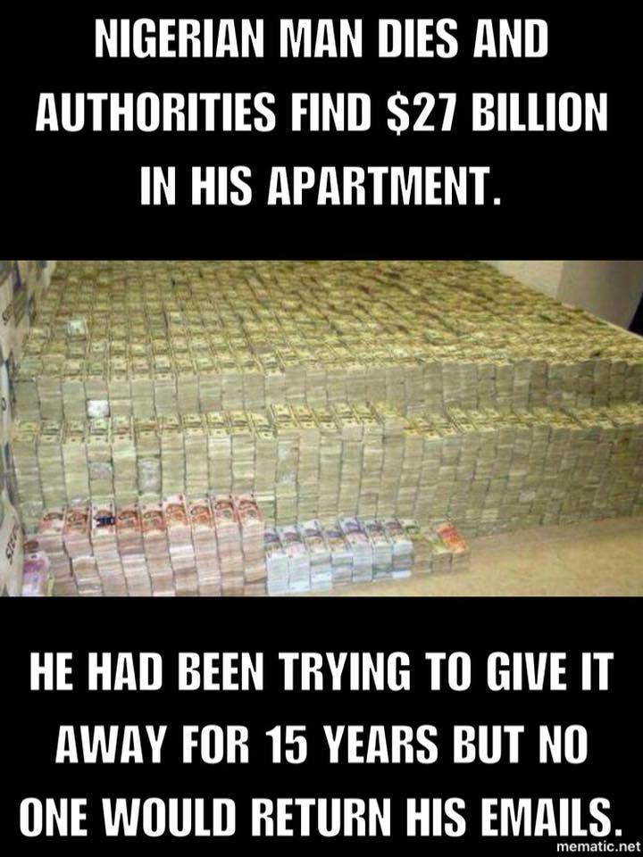 Надо прочесть камент к картинке и потом ржать. Тема актуальная для нашего форума для темы про аферистов. Там много раз обсуждалось про "нигерийские письма". А вот эта картинка - просто жёсткий стёб над этой темой ))